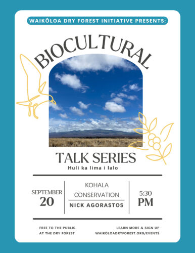 Talks are free and open to the public and hosted at the Waikōloa Dry Forest Preserve from 5:30-7:00 pm; pupus and refreshments will be provided. Sign-ups are required and donations are encouraged. We will record presentations and post videos to this page as they are available.