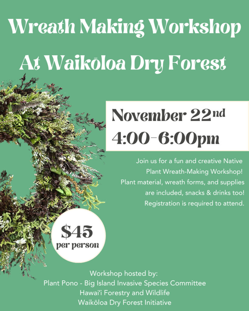 Join us for a fun and creative Native Plant Wreath-Making Workshop! Plant material, wreath forms, and supplies are included. Workshop hosted by Plant Pono, Big Island Invasive Species Committee, Hawaiʻi Forestry and Wildlife and Waikōloa Dry Forest Initiative.