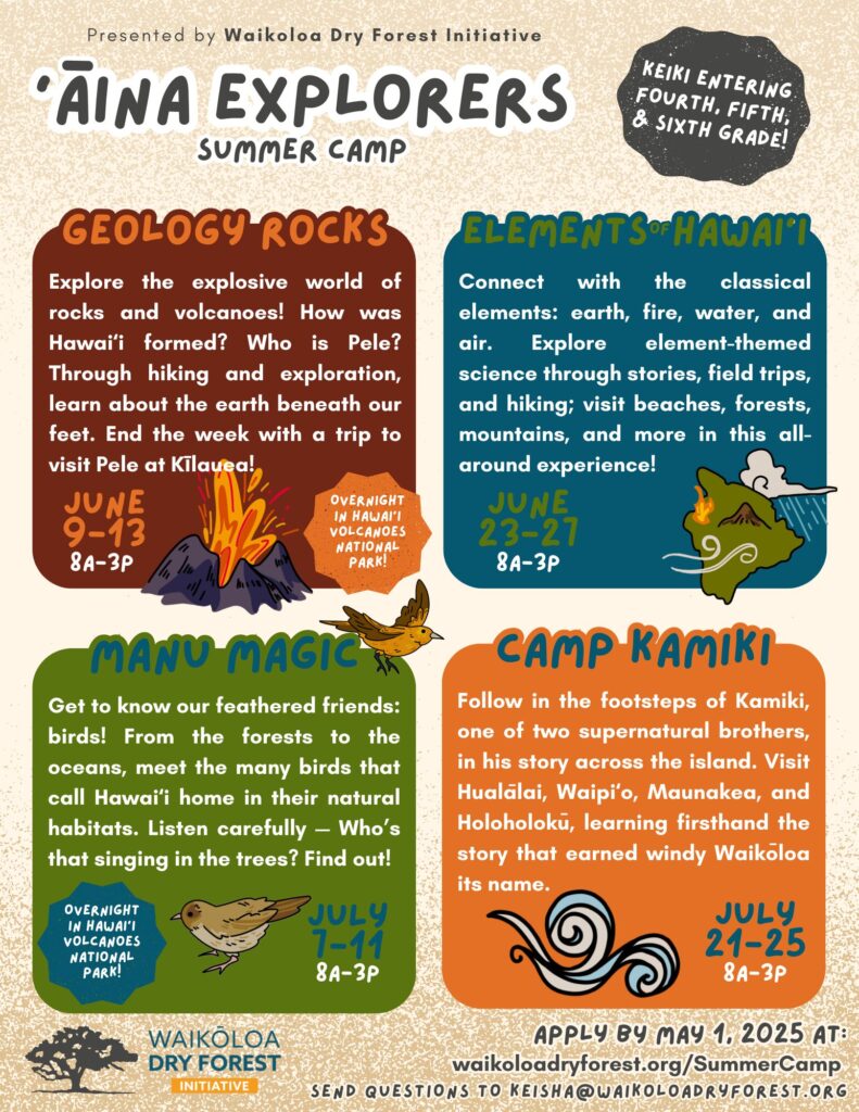 The ʻĀina Explorers Summer Camp is a FREE 5-day program that runs from 8:00am to 3:00pm Monday through Friday. The camps are based in the Waikōloa Dry Forest Preserve and pick up/drop off will be at Quarry Road.