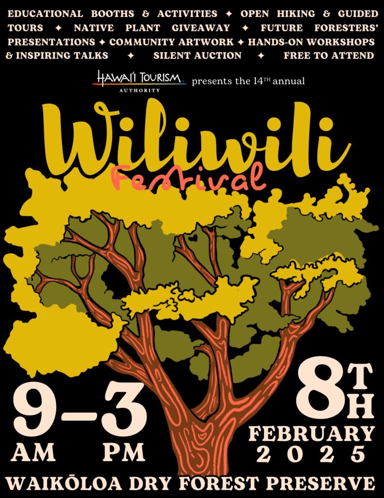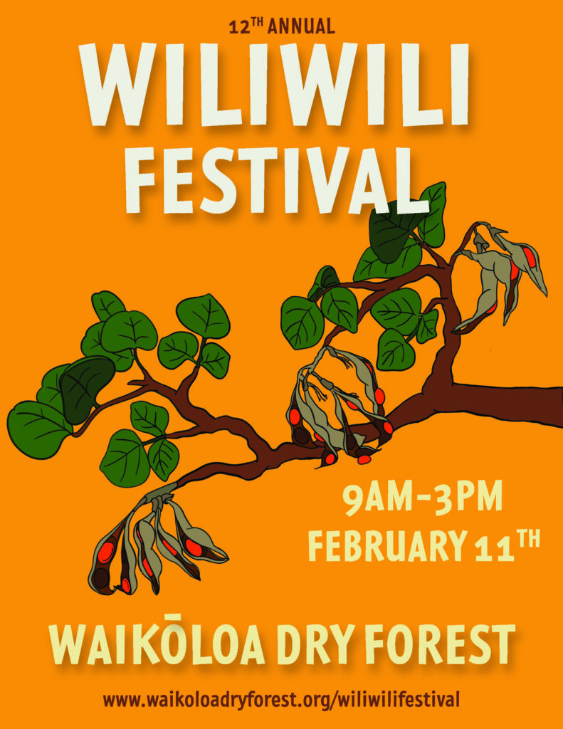 The 14th Annual Wiliwili Festival will be held on Saturday, February 8th from 9:00 am-3:00 pm at the Waikōloa Dry Forest Preserve. The Wiliwili Festival is a FREE public educational event for the whole family! This year our theme is Laulima – a tribute to the many mentors, leaders, cultural practitioners, scientists, volunteers, students, organizations, and community members who have joined hands to create, nurture, and grow the Waikōloa Dry Forest Preserve.