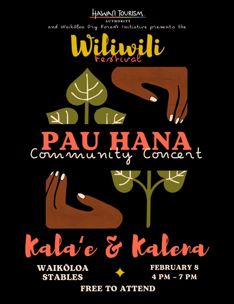 Join us after the festival for a free Pau Hana Community Concert at the Waikōloa Stables from 4:00 pm – 7:00 pm. This special evening event will feature a silent auction, delicious pūpū, cash bar, and live music with Kalaʻe & Kalena.
