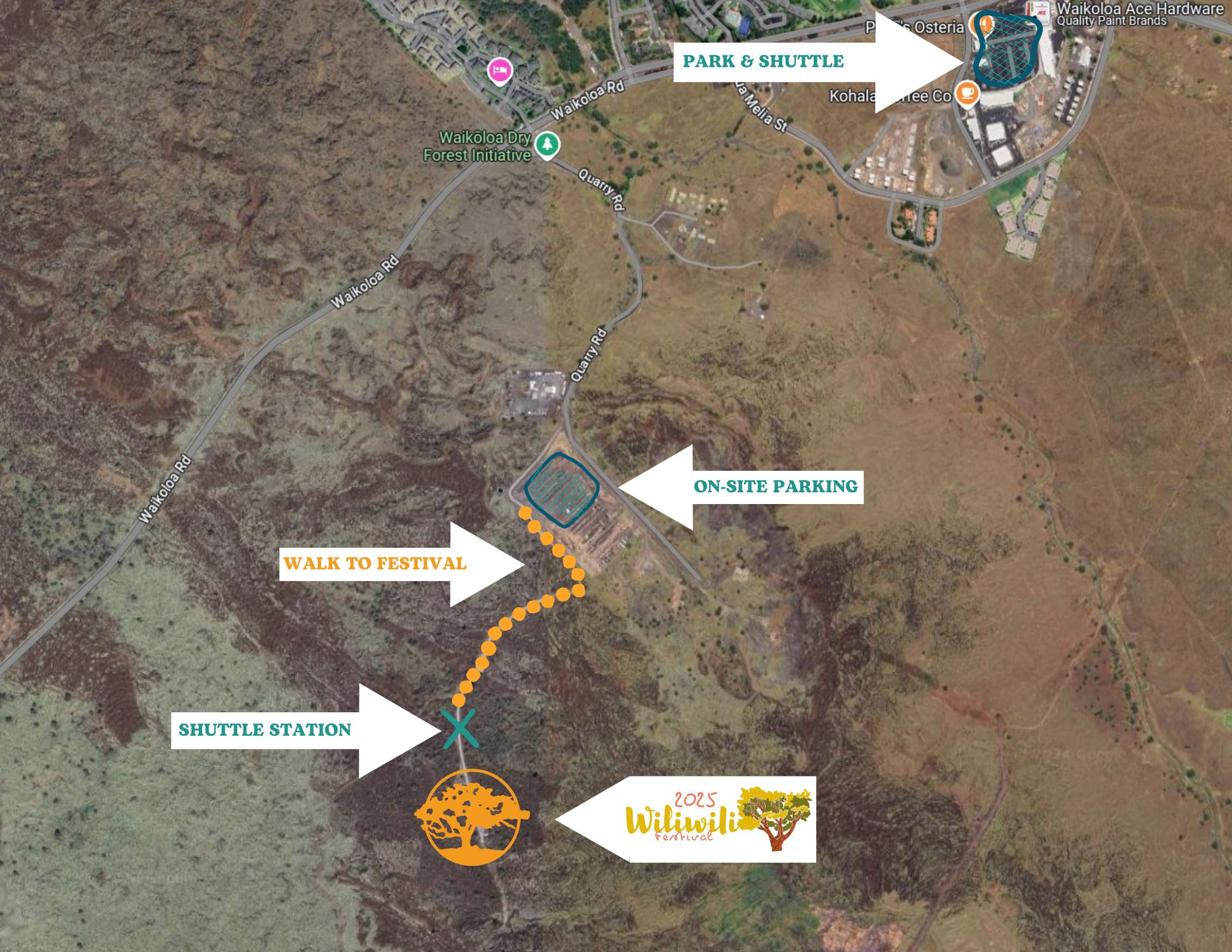 Parking: Park at the Waikōloa Plaza main parking lot and take a complimentary shuttle to the preserve! Limited on-site parking will also be available and golf cart shuttles will run between the parking area and the preserve’s front gate throughout the day. On-Site Parking